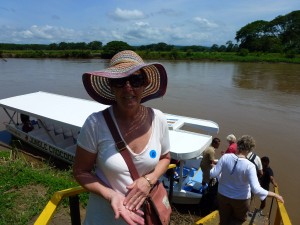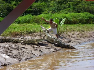 Our train (circa 1950) is basic, it’s a tourist special. We rock and bump along on it’s narrow gauge line, the grade is steep and we just seem to make about 40 kph most of the time. Passing small homes, farms as well as stretches of jungle the trip is very scenic. Pausing to look as some monkeys we note how hot and steamy it has become. ย At some un-named junction we jolt to a stop, our coaches are waiting nearby…mmm air conditioning. 15 minutes later we arrive at the Tarcoles River for our boat trip. To our surprise we are told the river is full of crocodiles and to keep our arms away from the water. During the next hour our boat driver stops twice and lures crocodiles out of the water with cuts of chicken. ย Given the slippery mud and we are talking about crocodiles in a river not a zoo, his antics appeared to be on the edge of suicidal. All the same it is a great journey experience. Then it’s back to the coach and half an hour later where back on the Infinity, enjoying a coffee and snack.
