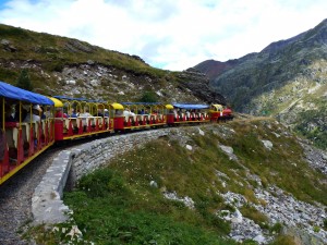 Once into the Valley d’Ossau we head south high into the valley until we arrive at Fabrages. It a small modern ski resort sitting on the edge of a dam used as part of the hydro electric system. We buy tickets for the Petit Train which include the initial trip up the mountain by gondola from 1200 to 2000 metres. Whilst everything in the resort level is very modern including the gondola, the Petit Train is the 1920 version. The line was built as part of the engineering works to construct the upper dam, now called Lake d’Artouste which sits at 1969 metres. The train doesn’t particularly climb or descent much during the 50 minute journey but meanders along the mountain sides hanging an somehow. The drop off the line into the valley below is breathtaking.