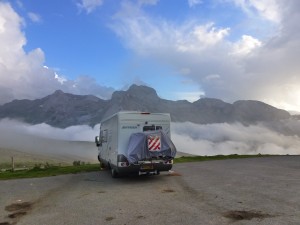 Five kilometres up the road we turn the crest of the range at Col d’Aubisque, they is a small car park on top of the mountain. Col d’Aubisque is a regular staging point for the tour and we can see why. Hopefully the pictures show you the view better than I can describe. We sit in our camper car, enjoying leftover pasta, beer and rose. Through our windows the scenery changes every few minutes as the fading sun changes the colour of the Pyrenees. The occasional cloud runs up the valley covers us then clears just as quickly. This could be our evening to remember.