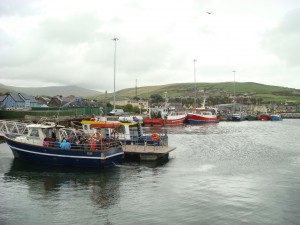 We arrive in Dingle before lunch and the place looks a bit quiet. Over the next hour tourists and locals seem to fill the place up. There are lots of little shops and Pam and Jenny are kept busy. The wharf area is full of small fishing boats all well painted and obviously in use. We manage a half good coffee, before heading back to the car. The Irish weather is closing again and we head out of town as the rain kicks in.