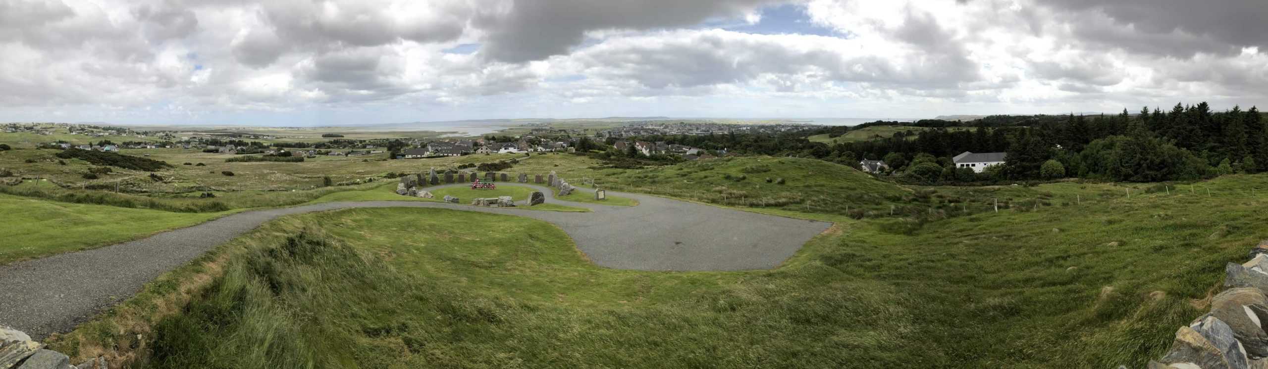 Soon enough we arrive in Stornoway our departure port back to mainland Scotland. We spot a sign for a war memorial on top of a hill, stop and go for a leg stretch. Using a circle of standing stones with plaques very fitting for this area.