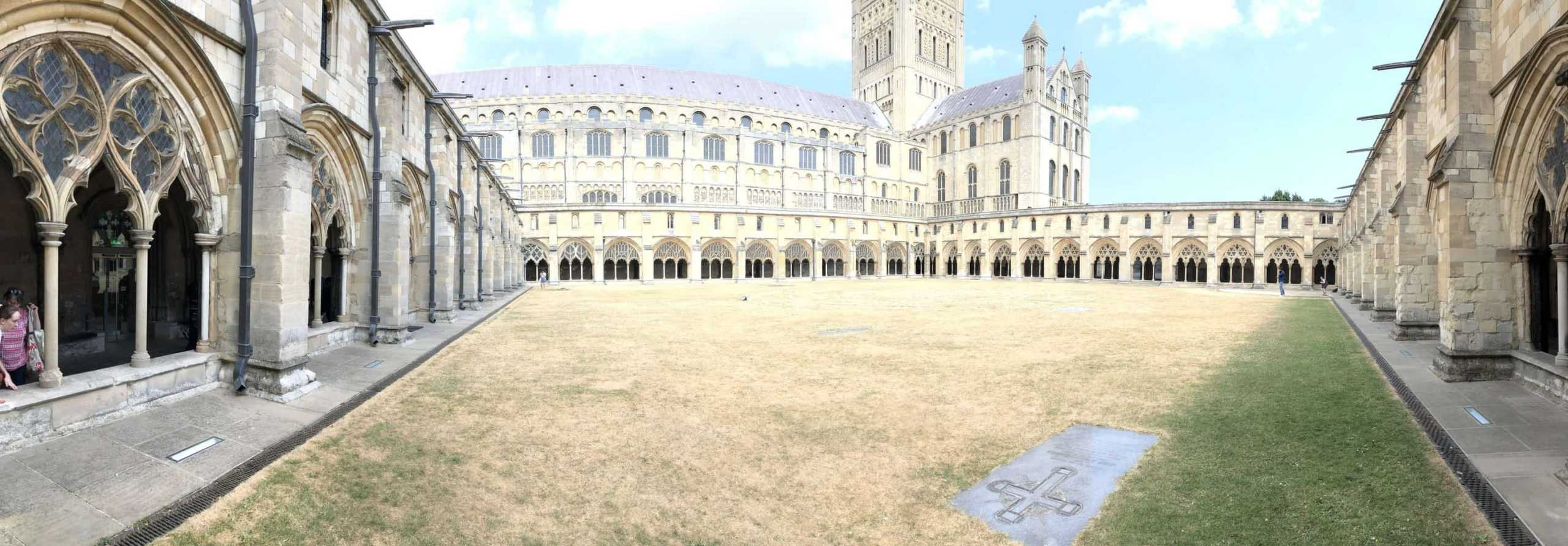 Looking across the cloisters to the crossover. Note how dry the grass is here. They currently have water restrictions in southern England.