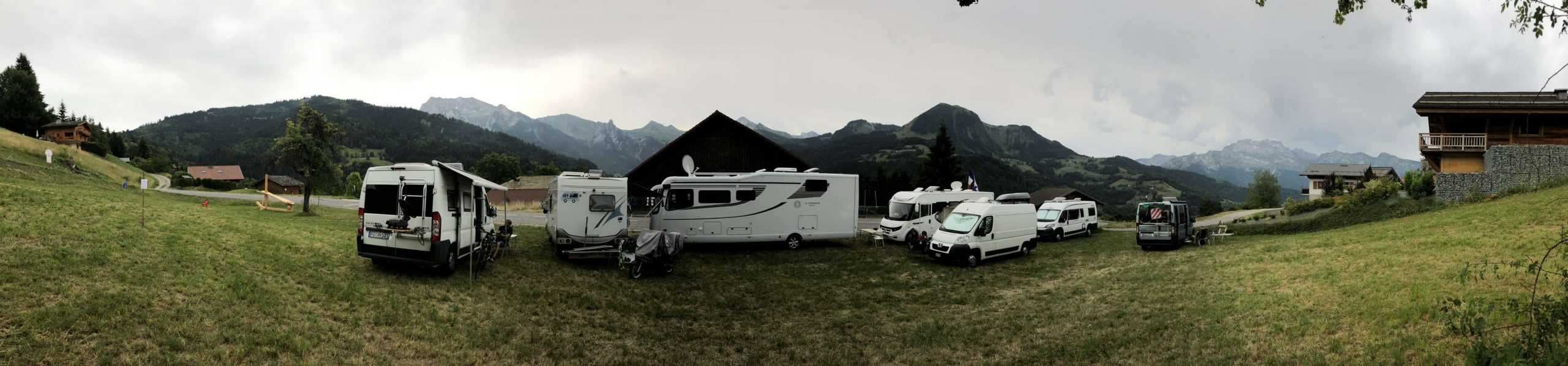 We spot a nice grassy corner 2 klm above Manigod at the 5 klm marker. We go over the road and chat with the lady who owns the property and she says we are welcome to stay.