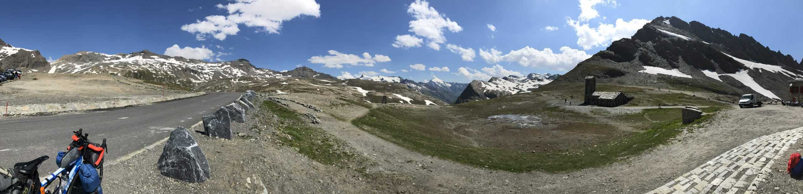 We enjoy some breathtaking scenery as the Hymer grinds its way to the top. It takes around 40 minutes to negotiate the hundred hairpin bends, but finally we make to Col de LโIsรฉran. At 2770 metres the highest road pass in Europe.
