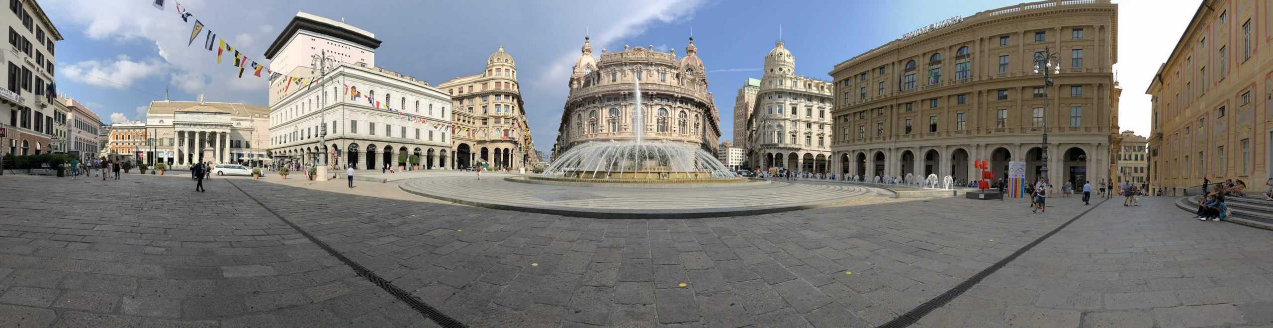 On the Piazza de Ferrari looking toward the cityโs opera house. We manage to find a TIM shop (Italyโs Telstra) and purchase at 30gb data sim for โฌ20. An absolute bargain compared to England and France.