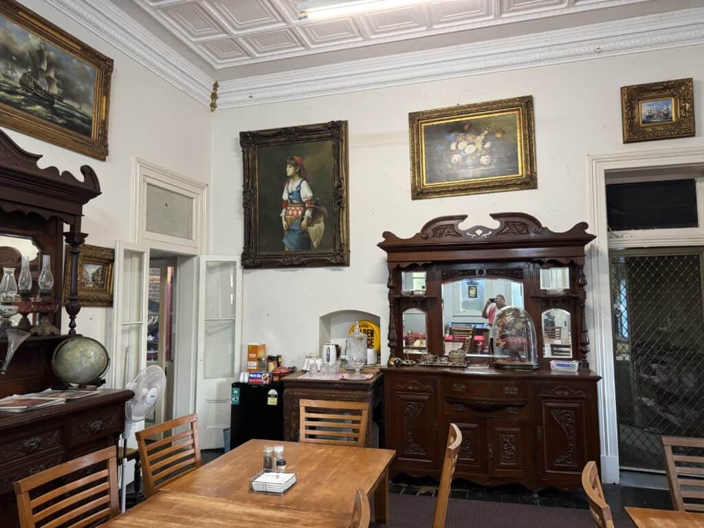 Inside the hotel the theme continues, but itโs obviously well maintained and decorated as a grand hotel of its era. Wandering in for a drink at drinking time Michael tells us to explore the hotel and have a look around. The Railway is huge probably 20 bedrooms all with 12โ ceilings in pressed metal. Caste iron and brass beds throughout itโs like stepping back in time. We enjoy a drink with the locals who all seem to wander in around 6 pm.