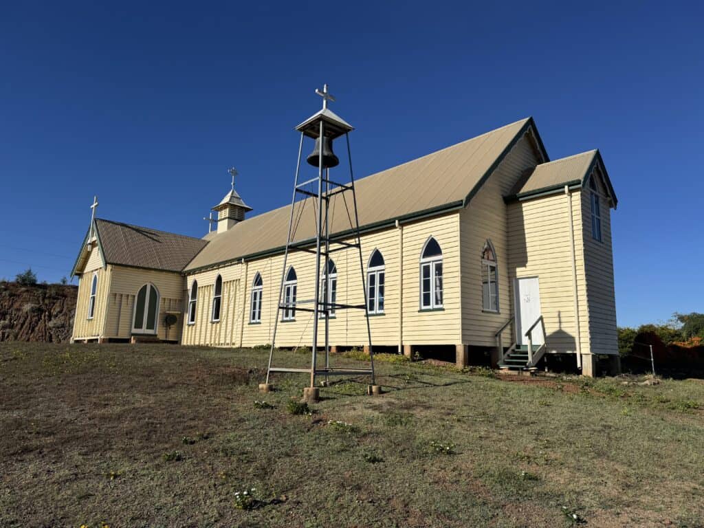 Our last stop is Saint Patrickโs Church (circa 1871, but extended in 1884). Itโs freshly painted and looks grand despite having the earth wall of the tailing dam only 50 metres behind it.