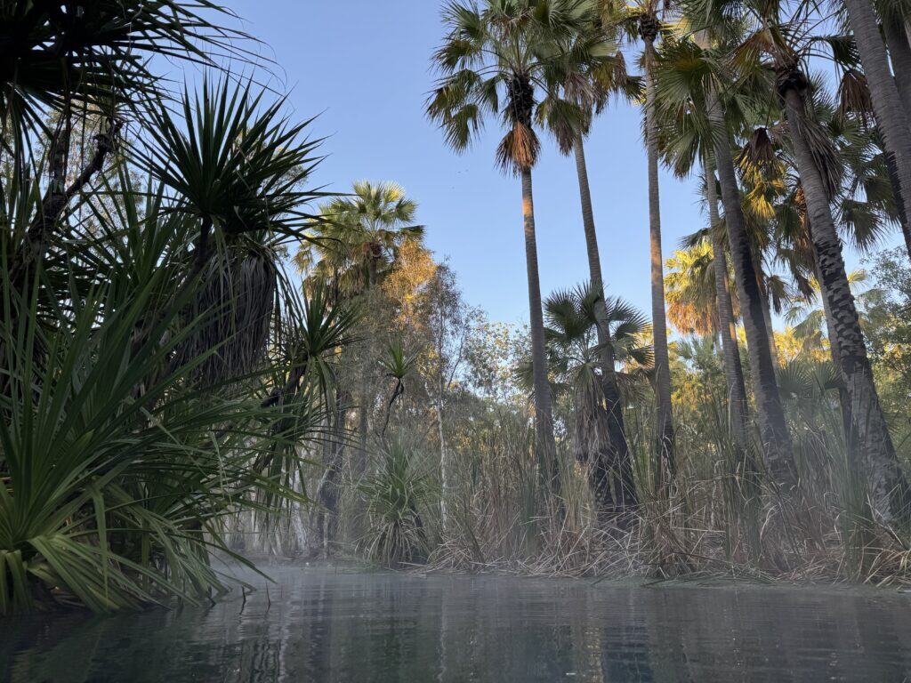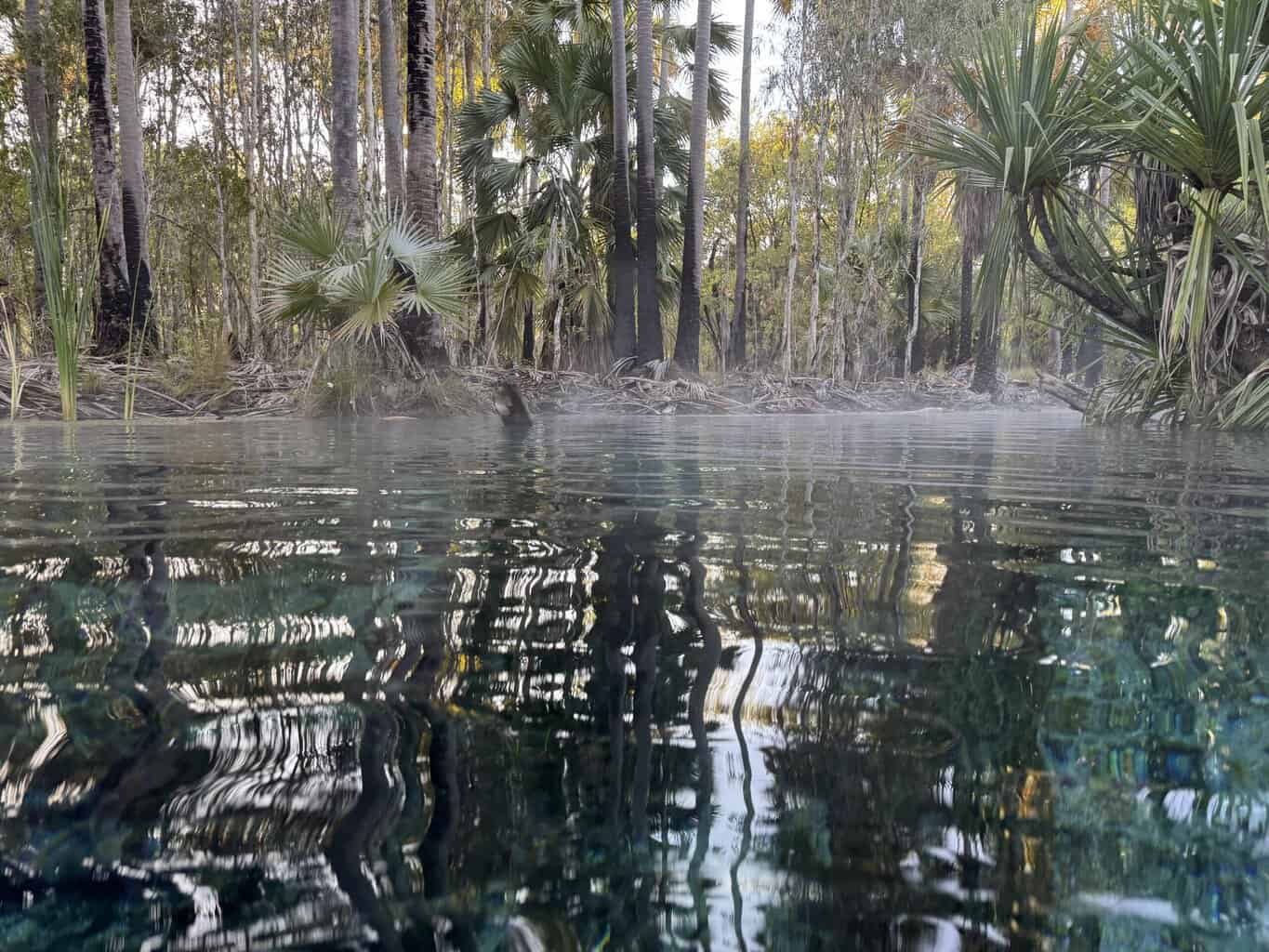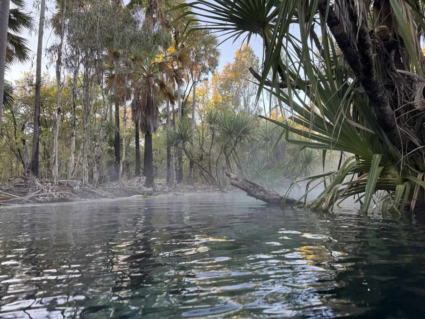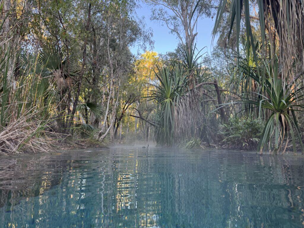Bitter Springs camping ground stands just outside the Elsey National Park about 120 kilometres south of Katherine. Once weโ€™ve settled in, we find itโ€™s about a 500m walk to the springs and thermal pool that leads from it. The spring creates a lush tropical woodland and groves of palm trees. This extends around the campground as well.