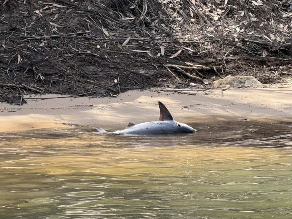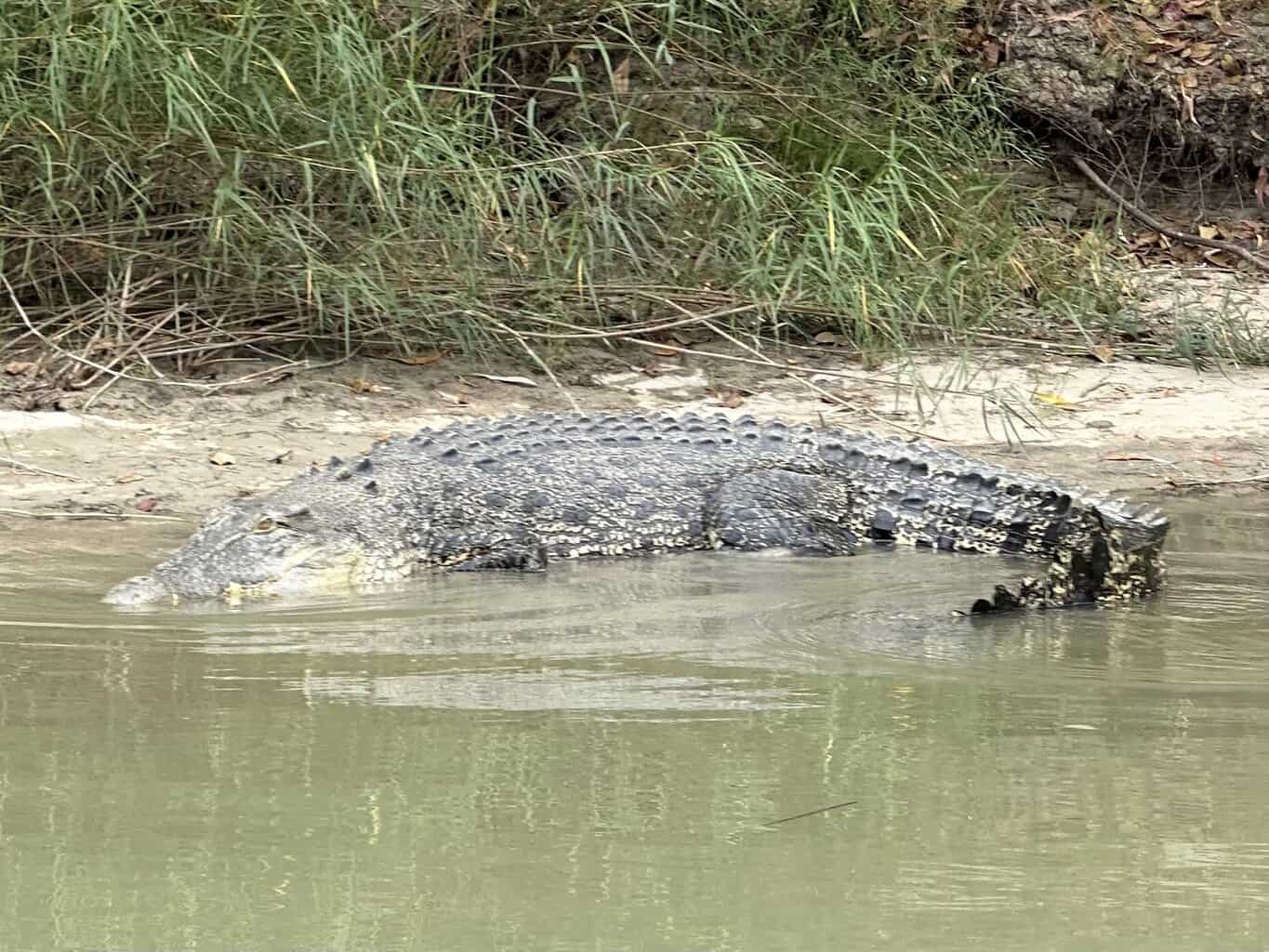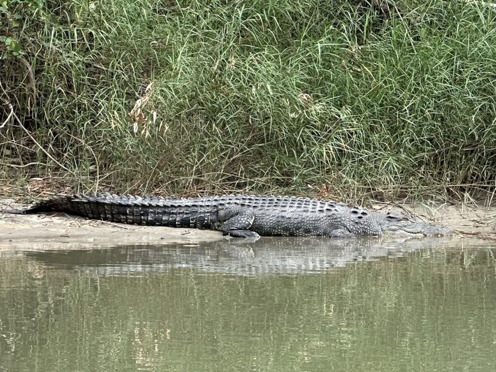 Then we turn back and motor back to towards Cahills, but just for a bonus, we spot a bull shark on the bank of the river. It has obviously been bitten by something. Then an adolescent croc about a metre long, Jimmy tells us they get darker as they age. All that lazing on the East Alligator catching rays I suppose.