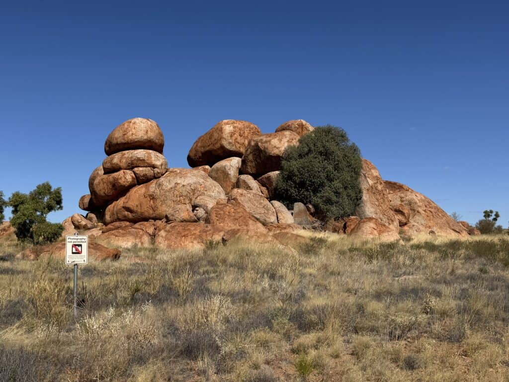 Continuing south some 90 kilometres we turn off the highway for the Devils Marbles. I stopped here in 1987, all the signage has evolved along with the name change to Karlu Karlu. What hasnโt changed, I remembered the Marbles as the most fly blown place I had ever visited and it still is.