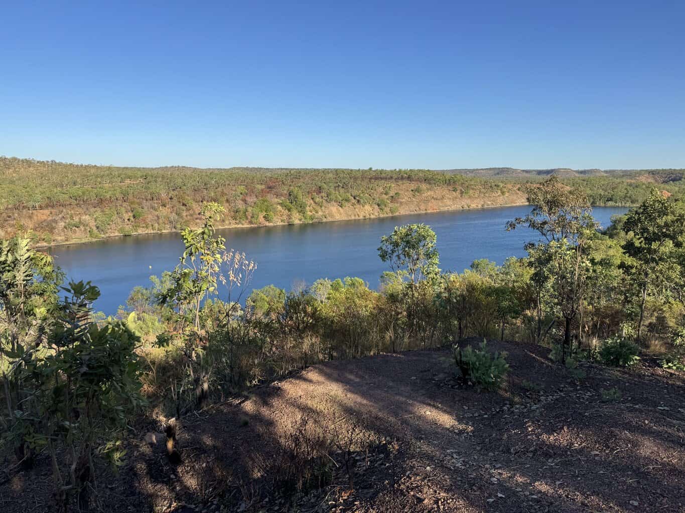 We have a nice spot in the shade and spend the afternoon in the pool or relaxing with a book. In the morning another one of Pamโs forced marches, this time to the lookout. To our surprise the lookout provides a panoramic view (pictured below) of the lake that was once an open cut gold mine. According to the information panels the water is 125 metres deep.