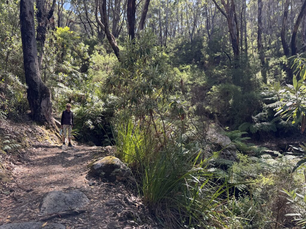 The track winds its way up and around Mount Bishop, then turns down through a forest of stringy bark trees. We turn for the Lilly Pilly nature walk, this 900m loop along an elevated walkway over a creek and adjoining wetland makes the climb up Bishop well worthwhile.