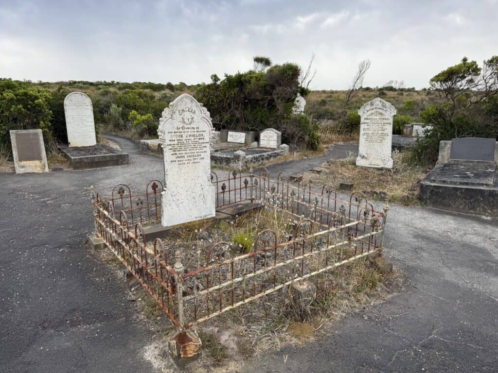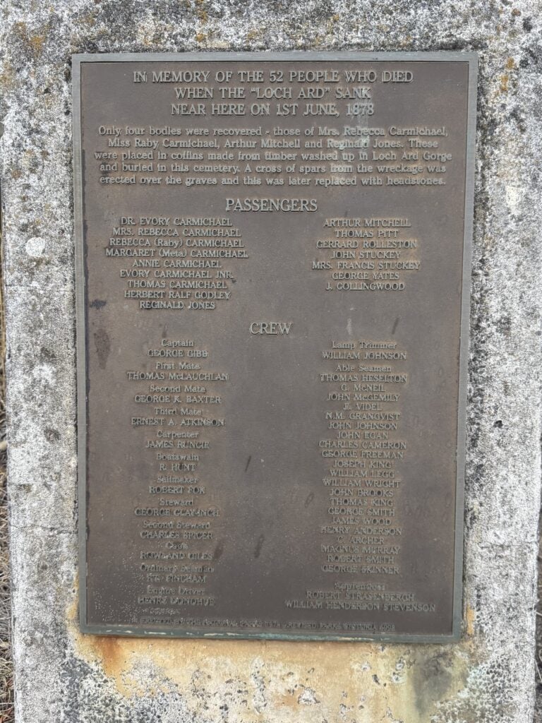 We see a sign to Loch Ard Cemetery and find our way up the path. The Loch Ard sank here in 1878, with the loss of 52 lives only 4 bodies were recovered to be later buried here. Since then the locals have used it.